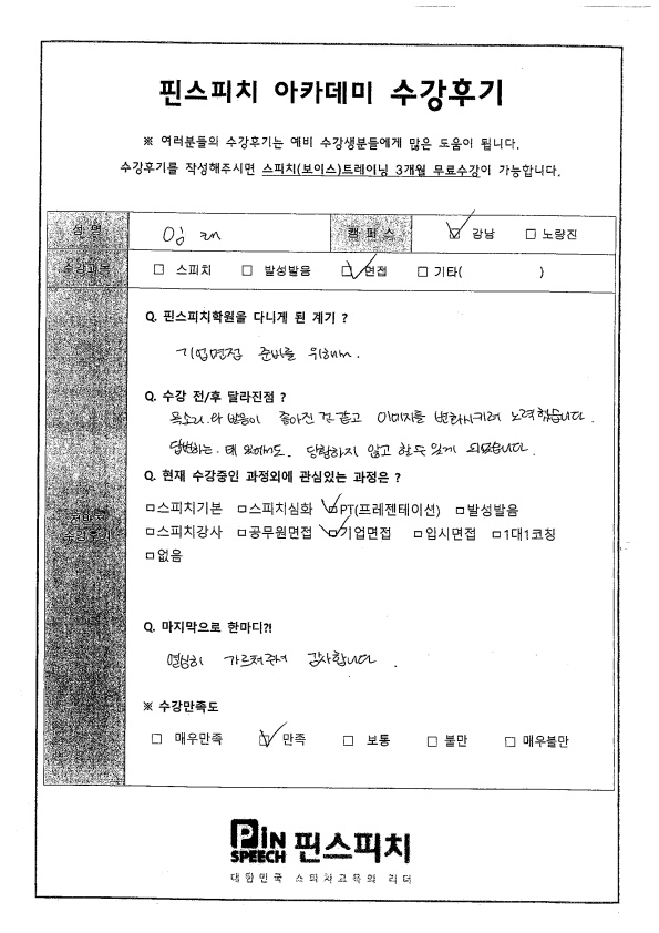 발성, 발음이 좋아졌고, 당황하지 않고 답변할 수 있게 되었습니다.