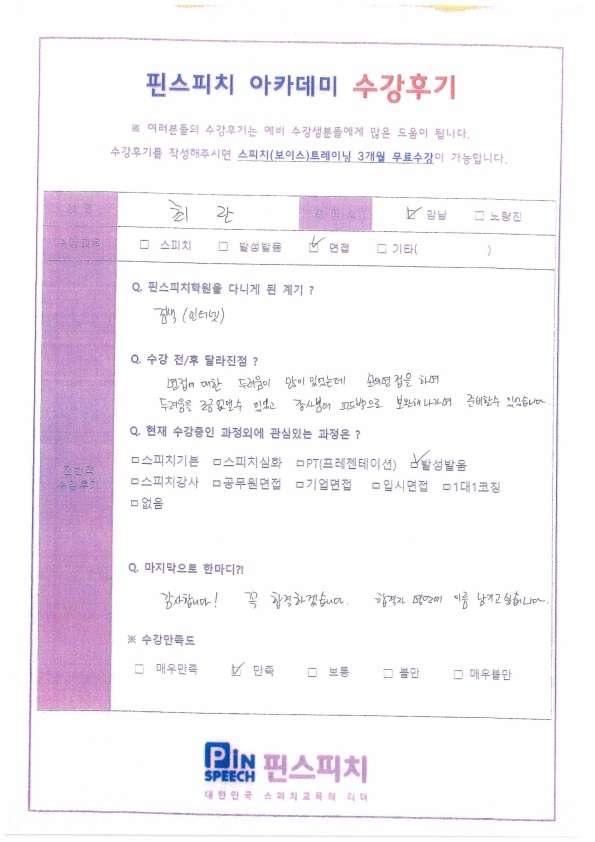 반복적인 모의면접과 선생님의 피드백을 통해 두려움을 없앨수있었습니다!