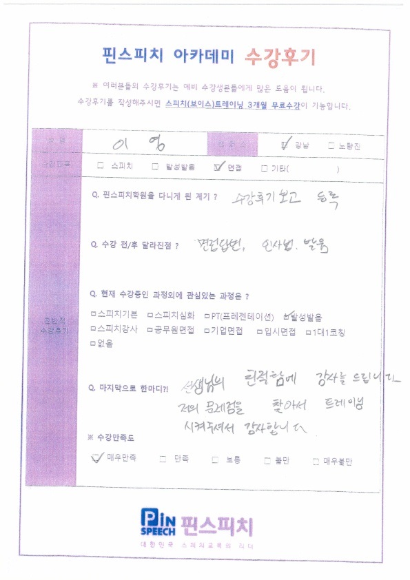 선생님들께서 면접에 대한 답변, 인사법, 발성발음 등 전체적으로 잡아주셨습니다.